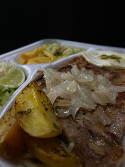 Acompanha arroz, feijão, farofa, batata frita, macarrão alho e óleo e salada.., Bsiteca