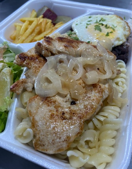 Acompanha arroz, feijão, farofa, batata frita, macarrão alho e óleo e salada.., ovo