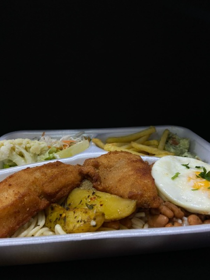Acompanha arroz, feijão, farofa, batata frita, macarrão alho e óleo e salada.., Peixe A Milanesa, ovo