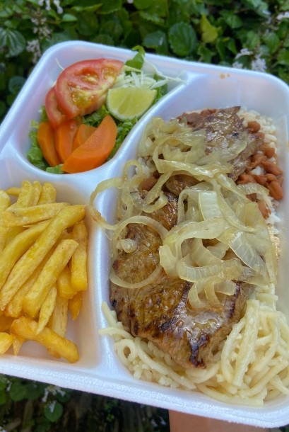 Acompanha arroz, feijão, farofa, batata frita, macarrão alho e óleo e salada.., Bife